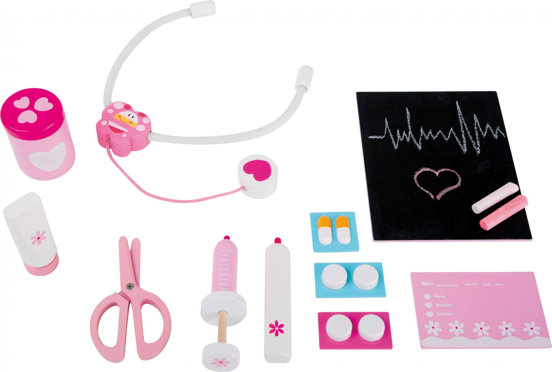 Patient suivant s’il vous plaît ! Ce kit de docteur aux couleurs pastel douces avec des petits motifs décoratifs est un bon équipement de base pour les futurs docteurs dans la chambre d’enfant. Il comprend un stéthoscope, seringue, ciseaux, comprimés et une carte d’ordonnance. Un petit tableau avec de la craie rose et blanche sert à noter les résultats d’analyse