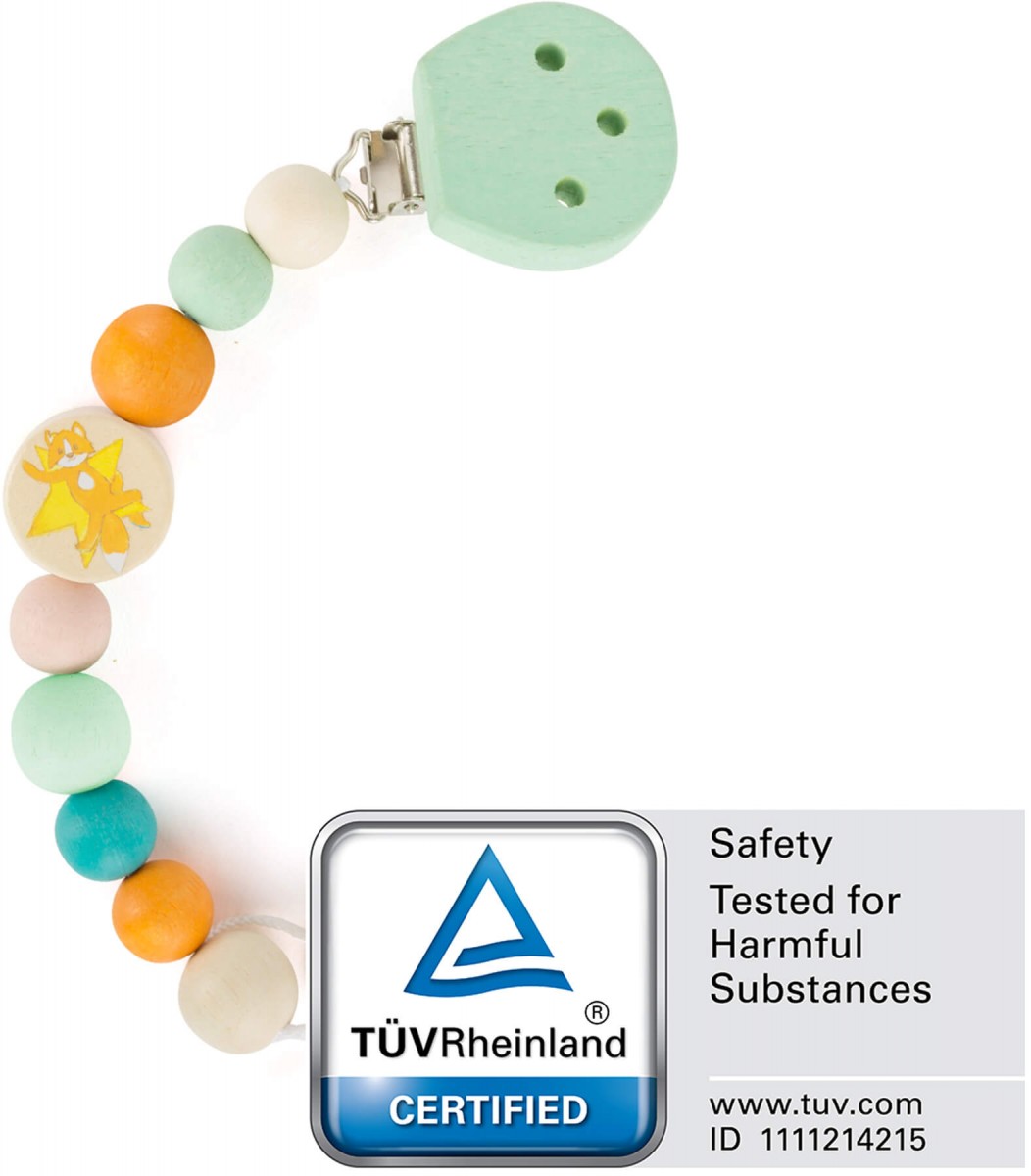 Le must pour tous les bébés! Avec cet attache sucette, bébé aura toujours sa sucette avec lui. Un élément pratique poour éviter les pleurs! En plus, plus besoin de la chercher. On sait tout de suite où est la sucette! Les tons pastel vont éveiller bébé et l'illustration du renard Lex le fera rêver.