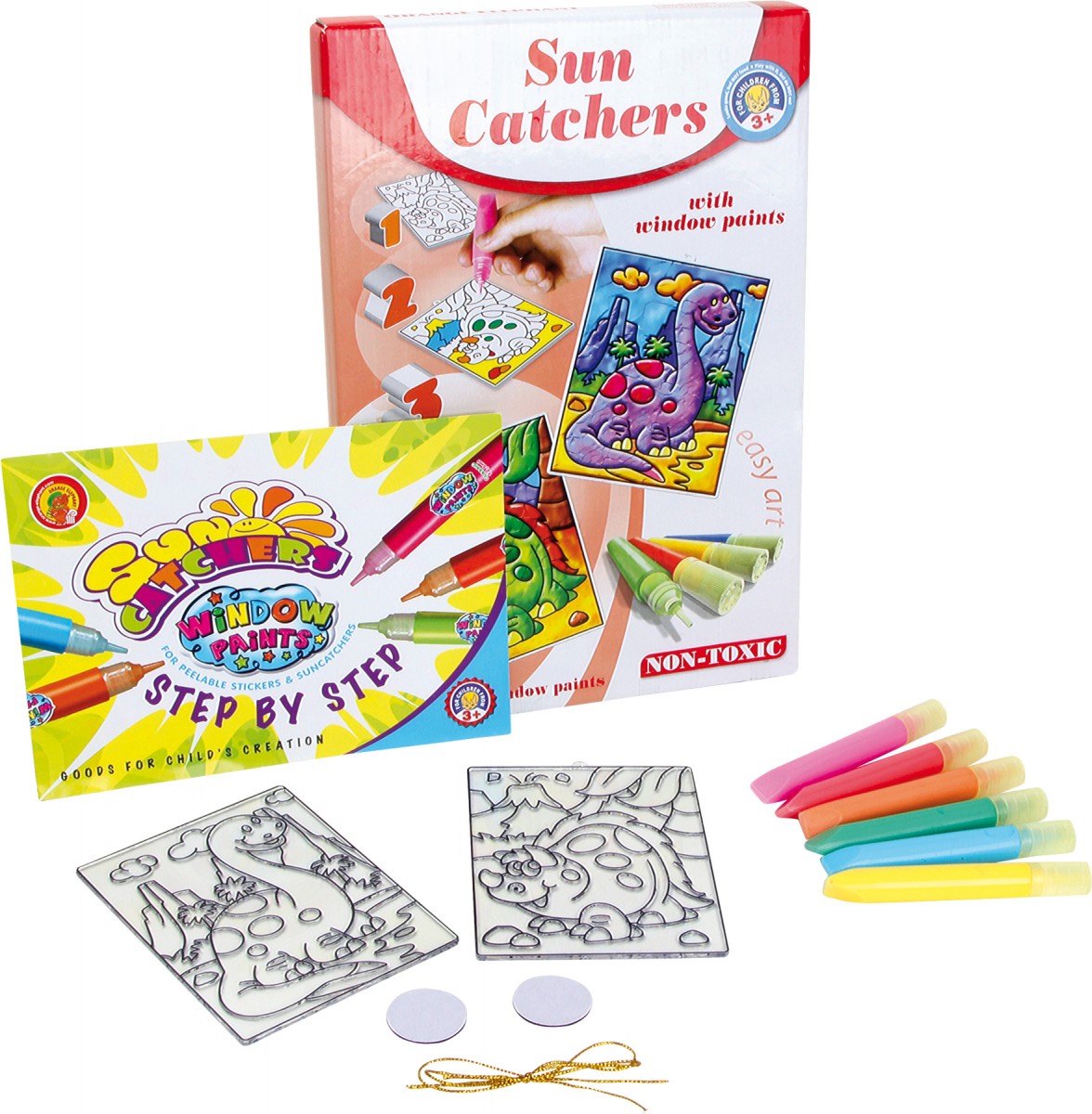 Pousser sur le tube et …. mettre de la couleur dans les contours correspondants. Les petits artisans créeront deux „suncatcher“ avec de jolis motifs de dinosaures. Les six crayons de couleurs peuvent être utilisés pour d´autres créations sur les fenêtres – l´imagination n´a pas de limites !