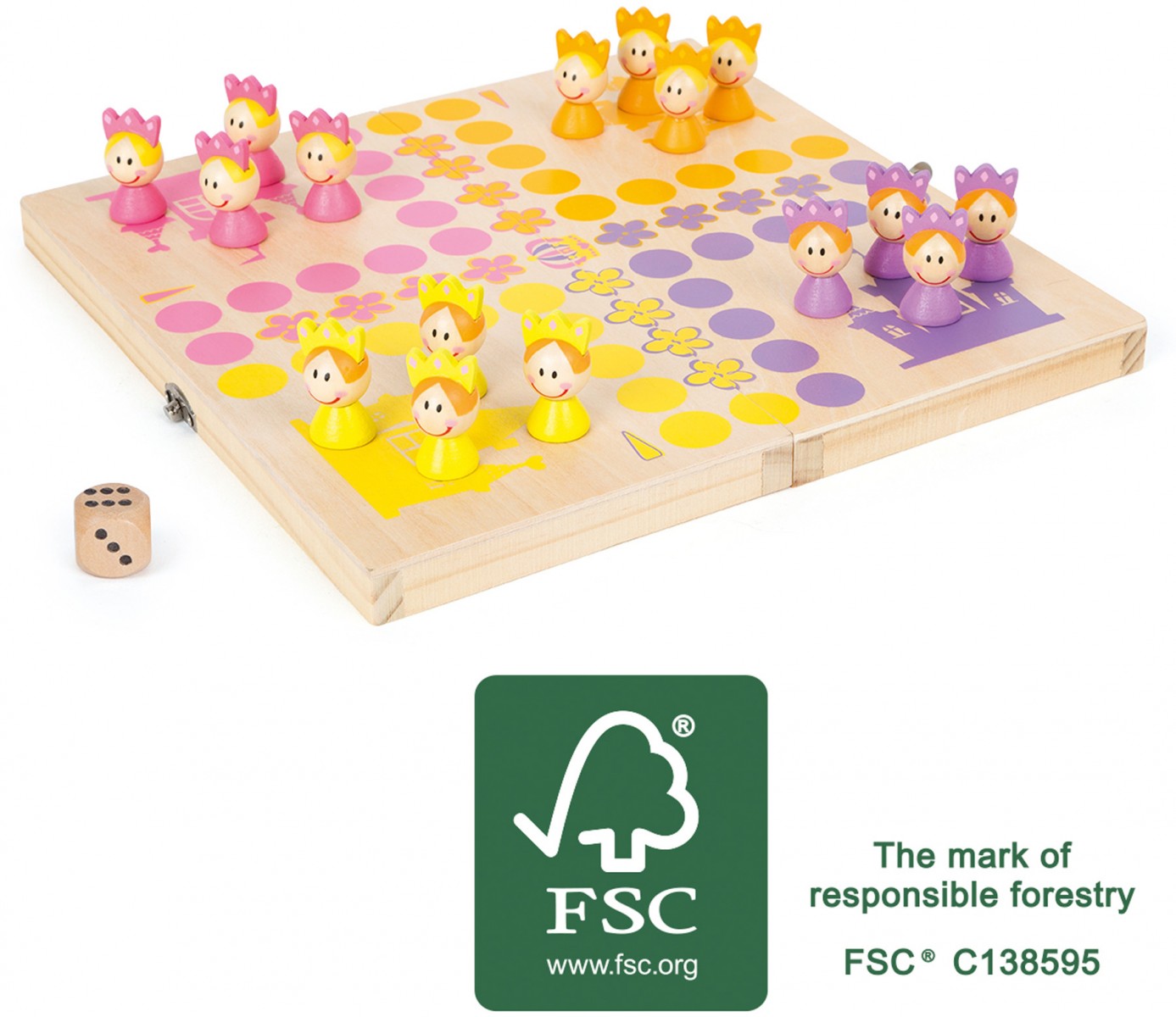 À l'assaut de la couronne! Les petites princesses piaffent d'impatience et essaient d'atteindre la couronne en premier! En bois robuste certifié FSC® 100% et au visage souriant, les princesses avancent au son du dé. Un joli jeu développant la compréhension des chiffres et les compétences sociales! Boîte de rangement pratique pliable à emporter en vacances!